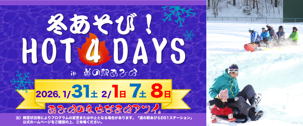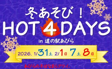 お知らせ 2026.01.10 【1/31・2/1・2/7・2/8】 冬あそび!HOT4DAYS開催! 2026.01.08 \道の駅スタッフを募集しています/ 2026.01.02 D51ステーション「新春企画2026」のお知らせ ショップを楽しむ 物産品・ベーカリー テイクアウト 農産物直売 あびらストーリー イベントカレンダー 202601.31【1/31・2/1・2/7・2/8】 冬あそび!HOT4DAYS開催! 202601.04D51ステーション「新春企画2026」のお知らせ 2026.1イベントのご案内 Sun Mon Tue Wed Thu Fri Sat 123 4・5678910 11121314151617 18192021222324 25262728293031・ 新千歳空港から 車で30分 絶景・あびらの 菜の花畑 鉄道のまち・あびらは SLラストランの地 国内チーズ・ 専門工場発祥の地 名馬の故郷で 感動ふたたび 自慢の糖度 「アサヒメロン」