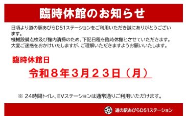 お知らせ 2026.02.06 2/7(土)~8(日)の『冬あそび!HOT4DAYS』コンテンツ情報について 2026.01.10 【1/31・2/1・2/7・2/8】 冬あそび!HOT4DAYS開催! 2026.01.02 D51ステーション「新春企画2026」のお知らせ ショップを楽しむ 物産品・ベーカリー テイクアウト 農産物直売 あびらストーリー イベントカレンダー 202602.08【1/31・2/1・2/7・2/8】 冬あそび!HOT4DAYS開催! 202602.07【1/31・2/1・2/7・2/8】 冬あそび!HOT4DAYS開催! 202602.01【1/31・2/1・2/7・2/8】 冬あそび!HOT4DAYS開催! 2026.2イベントのご案内 Sun Mon Tue Wed Thu Fri Sat 1・234567・ 8・91011121314 15161718192021 22232425262728 新千歳空港から 車で30分 絶景・あびらの 菜の花畑 鉄道のまち・あびらは SLラストランの地 国内チーズ・ 専門工場発祥の地 名馬の故郷で 感動ふたたび 自慢の糖度 「アサヒメロン」