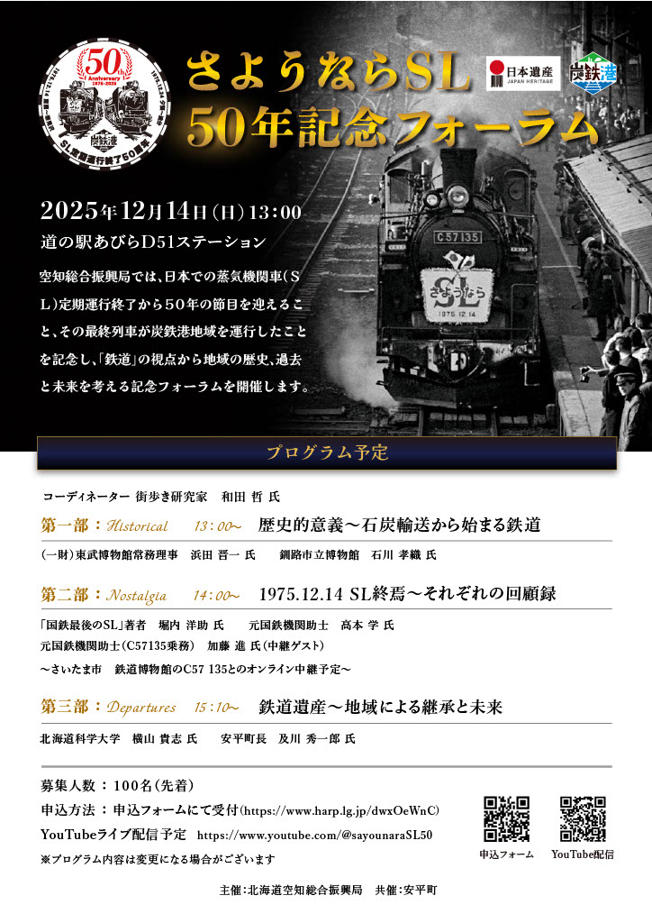 道の駅あびらD51ステーションでは、次の日程で、記念フォーラムが開催されます。 詳細は、次のURLからご確認ください。
