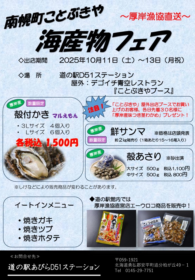 10月11日(土)~13日(月祝)の3日間、厚岸の海産物で人気の『南幌ことぶきや』が特別出店します!