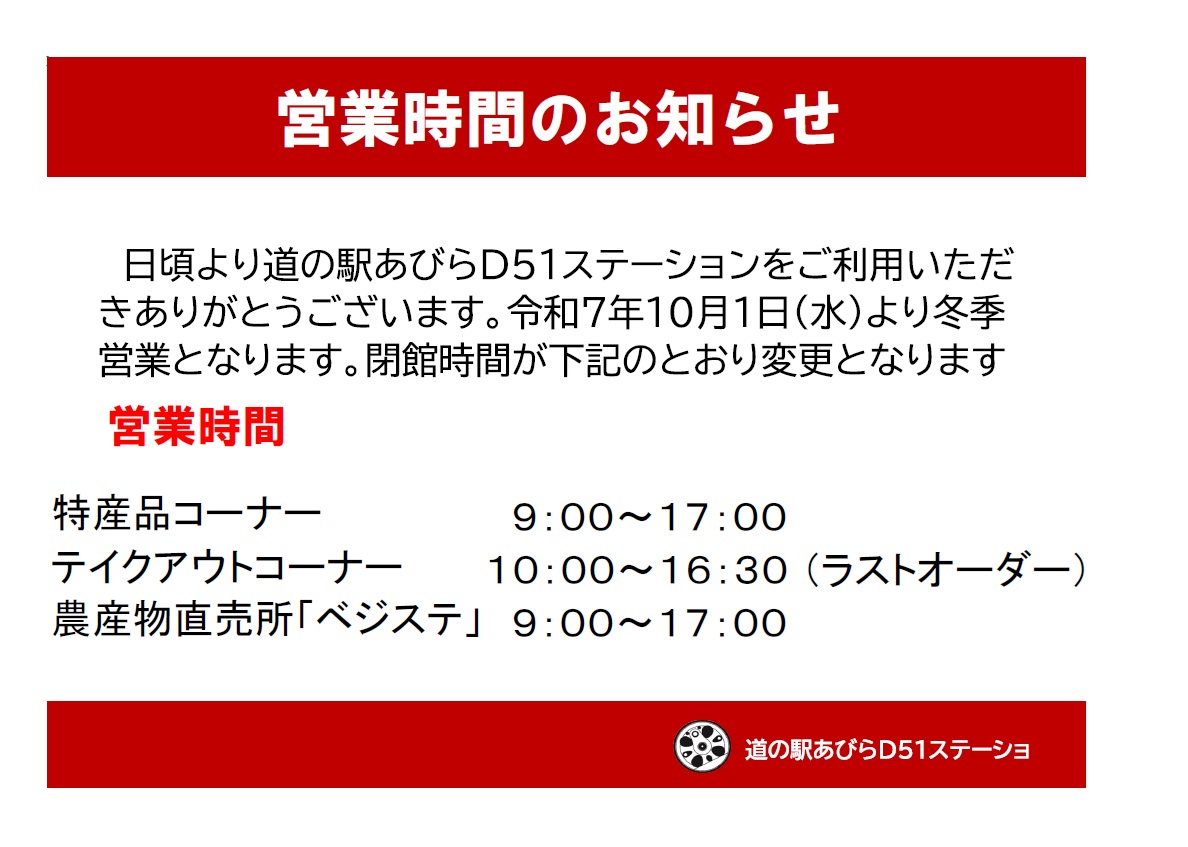 日頃より道の駅あびらD51ステーションをご利用いただきありがとうございます。