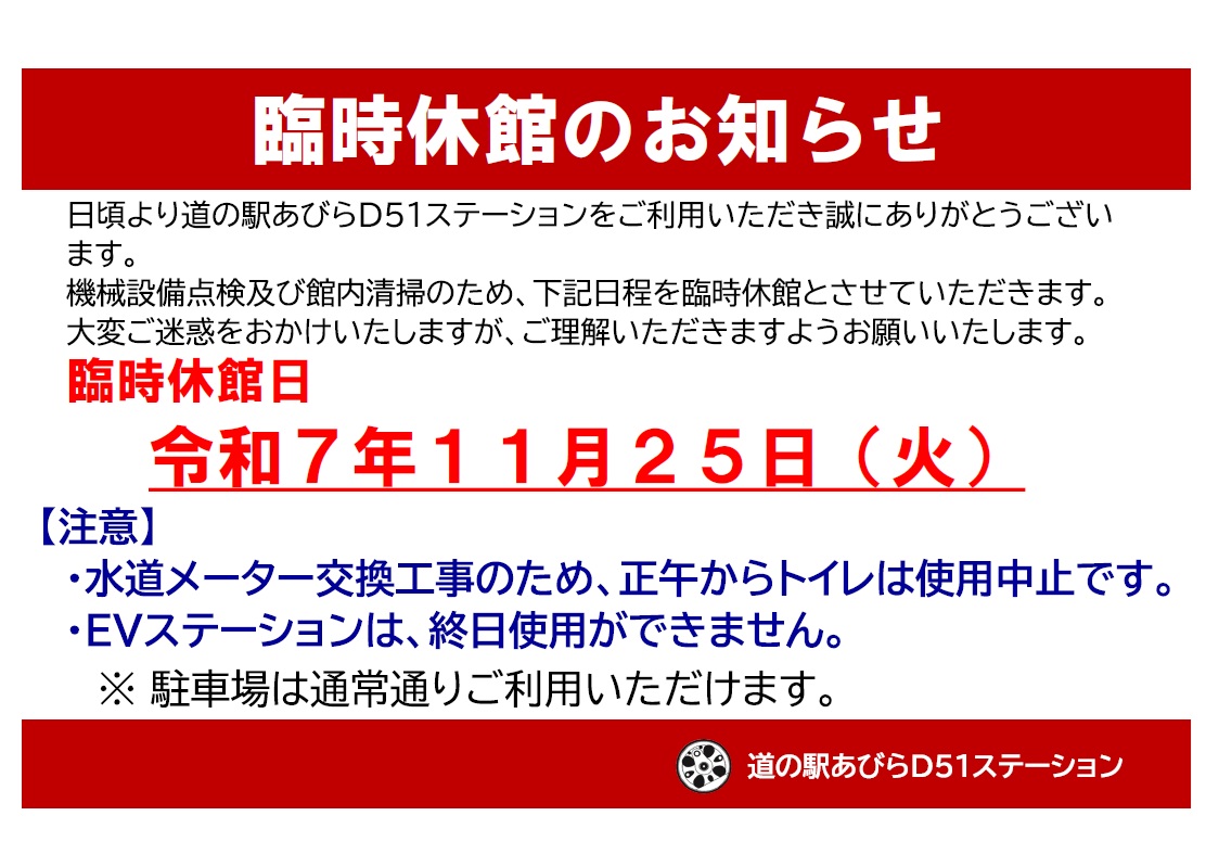 日頃より「道の駅あびらD51ステーション」をご利用いただき誠にありがとうございます。