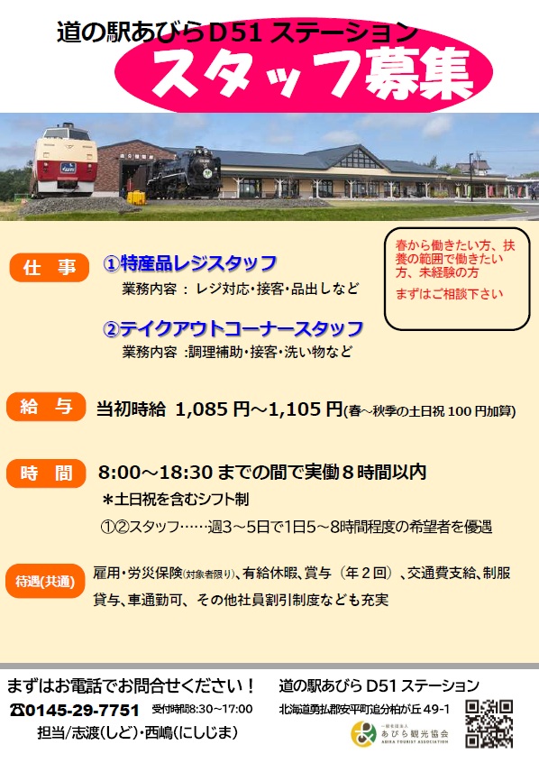 道の駅あびらD51ステーションでは、一緒に働くスタッフを募集しています!