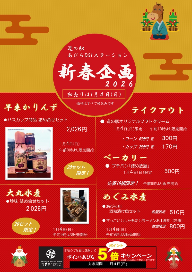 更に1月4日(日)は、「ポイントあびら」のポイント5倍キャンペーンも実施。大変お得となっています!